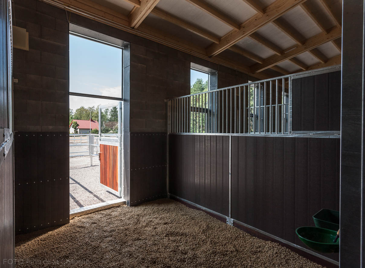 Päivittäisen tarhauksen lisäksi jokaisessa karsinassa terassiulkoiluun tarkoitettu uloskäynti. Terassit ovat karsinakohtaisia, ja hevosille turvallisia. |